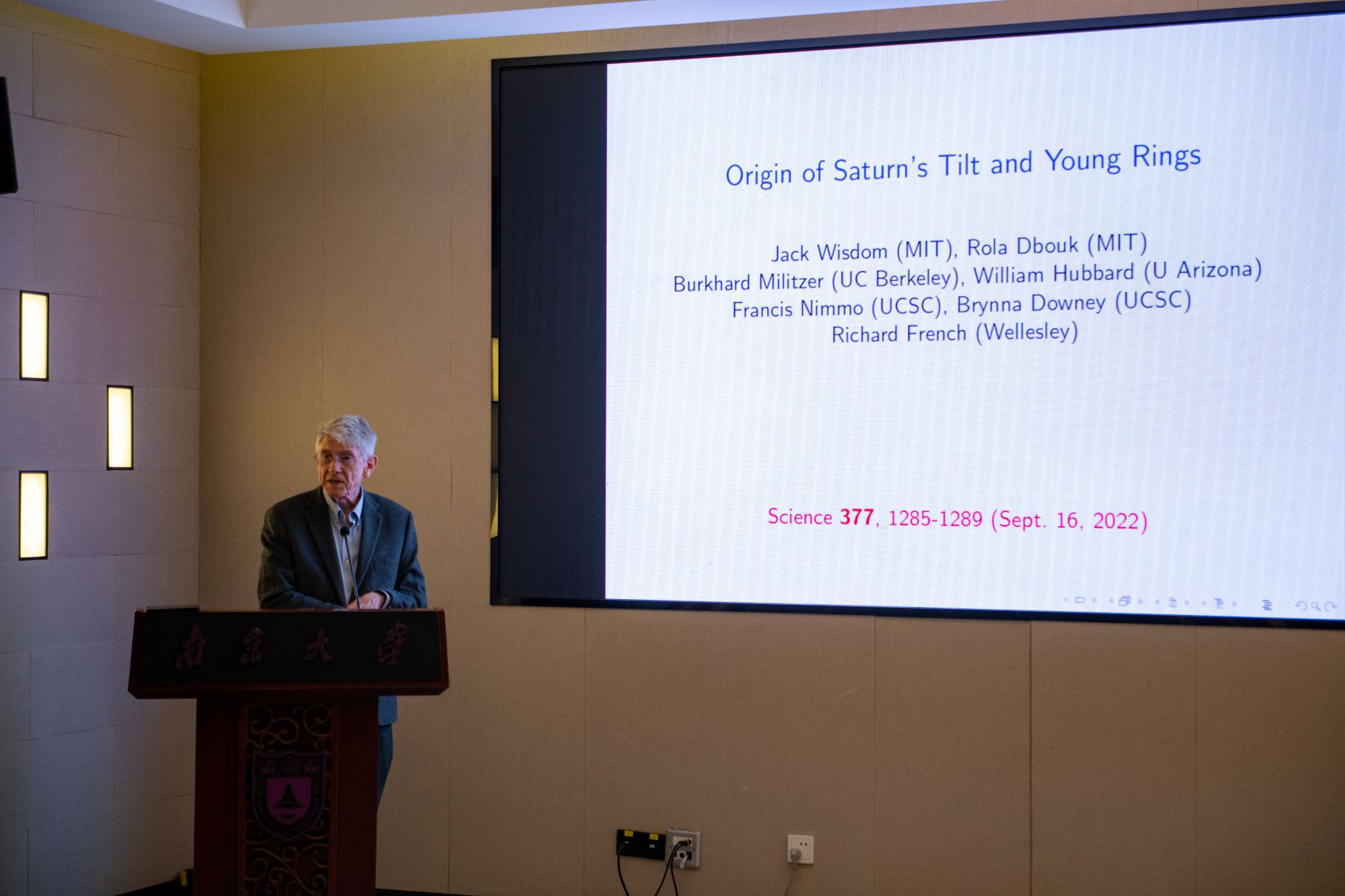 On May 19th, the 22nd Academic Lecture of Xianlin Forum was held. Jack Wisdom, Professor of Massachusetts Institute of Technology, Member of the National Academy of Sciences (NAS) and the American Academy of Arts and Sciences (AAAS)United States, gave an academic lecture titled "Origin of Saturn's Tilt and Young Rings". Professor Zheng Hairong, Vice President of Nanjing University, and Academician of the Chinese Academy of Sciences (CAS), attended the forum.