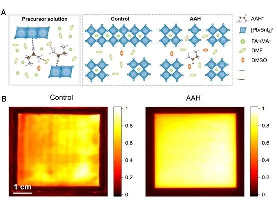 Scalable fabrication of all-perovskite tandem solar cells is challenging because the narrow-bandgap subcells made of mixed lead-tin (Pb-Sn) perovskite films suffer from nonuniform crystallization and inferior buried perovskite interfaces. We used a dopant from Good’s list of biochemical buffers, aminoacetamide hydrochloride, to homogenize perovskite crystallization and used it to extend the processing window for blade-coating Pb-Sn perovskite films and to selectively passivate defects at the buried perovskite interface. The resulting all-perovskite tandem solar module exhibited a certified power conversion efficiency of 24.5% with an aperture area of 20.25 square centimeters.