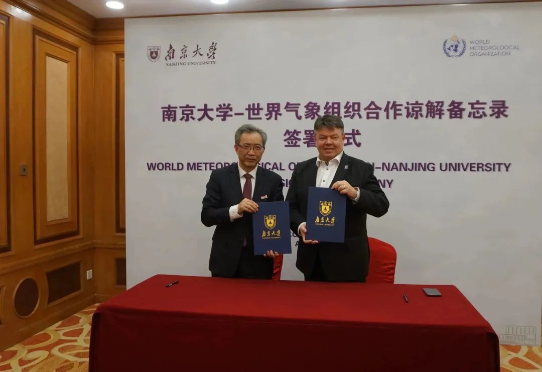 On April 12, Prof. Tan Zhemin, Academician of the Chinese Academy of Sciences and President of Nanjing University (NJU), met with Prof. Petteri TAALAS, Secretary-General of World Meteorological Organization (WMO), and Zhang Wenjian, Assistant Secretary-General of WMO in Beijing. The two sides exchanged views on deepening cooperation and signed a Memorandum of Understanding.