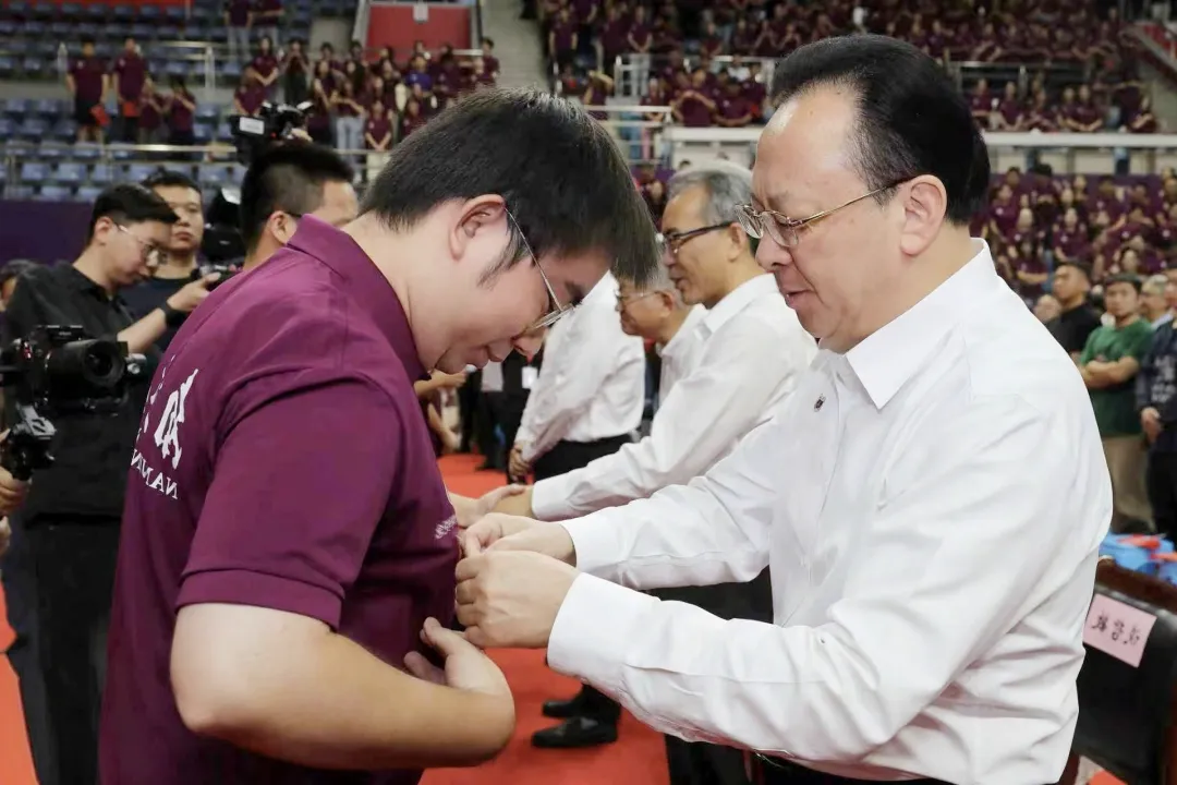 校徽佩戴仪式上,与会校领导和嘉宾为新生代表授校徽。全体新生为自己佩戴上这枚象征“凯发人”身份的徽章,正式成为凯发k8官网的一员。