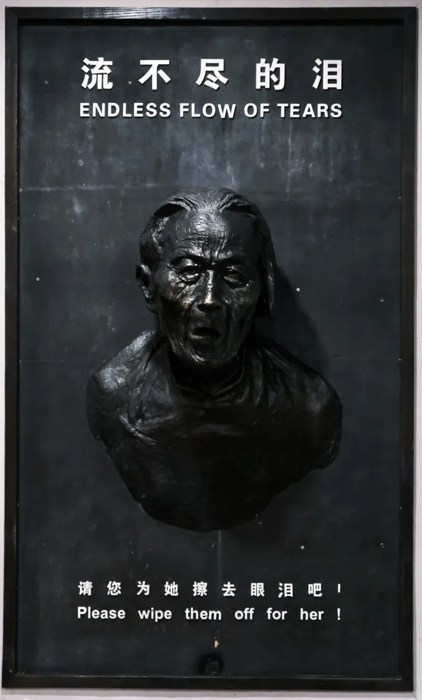 馆内有一座“流不尽的泪”老人雕塑:从墙体里挣脱出半个身子的老人,表情异常痛苦,满脸是泪。参观者驻足、凝望、沉思,拿起一旁的手帕,为老人拭去泪水。然而不久后,泪水又汩汩流出,象征着受害者的眼泪永远不会干涸。
