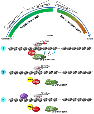 进一步研究表明,MYB27在拟南芥营养生长早期以及生殖生长过程中通过与PRC2复合体的几个成员互作,从而招募“SEAIR-PRC2”复合体至SE位点,引起SE第一个外显子区域H3K27me3的富集,抑制SE的表达(图1)。在拟南芥营养生长后期,PAR2通过与MYB27互作,导致MYB27既不能招募“SEAIR-PRC2”复合体,也不能结合SE的启动子区域,从而降低SE第一个外显子区域H3K27me3的水平,促进SE的表达(图1)。