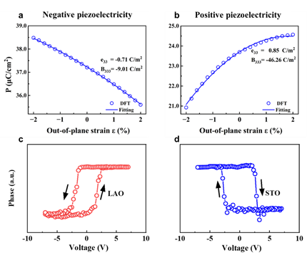 图3 铪基铁电薄膜的压电响应。(a-b) 外延应变为(a) -3.0%及(b) 3.0%时,面外极化和纵向应变的变化关系;(c-d) 沉积在(c) LAO和(d) STO衬底上的HZO薄膜PFM相位回路。