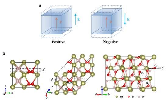 图1 (a) 正负压电效应示意图。(b) 氧化铪Pca21铁电相的原子结构示意图: 左图为12个原子的原胞结构示意图,a沿[100]方向,b沿[010]方向, c沿[001]方向;中图和右图为沿不同方向显示的36个原子超胞。