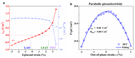 图2 外延应变下氧化铪的压电响应。(a) 不同外延应变下氧化铪的线性压电系数e33和二次压电系数B333;(b) 外延应变为0.9%时,面外极化和纵向应变的变化曲线。