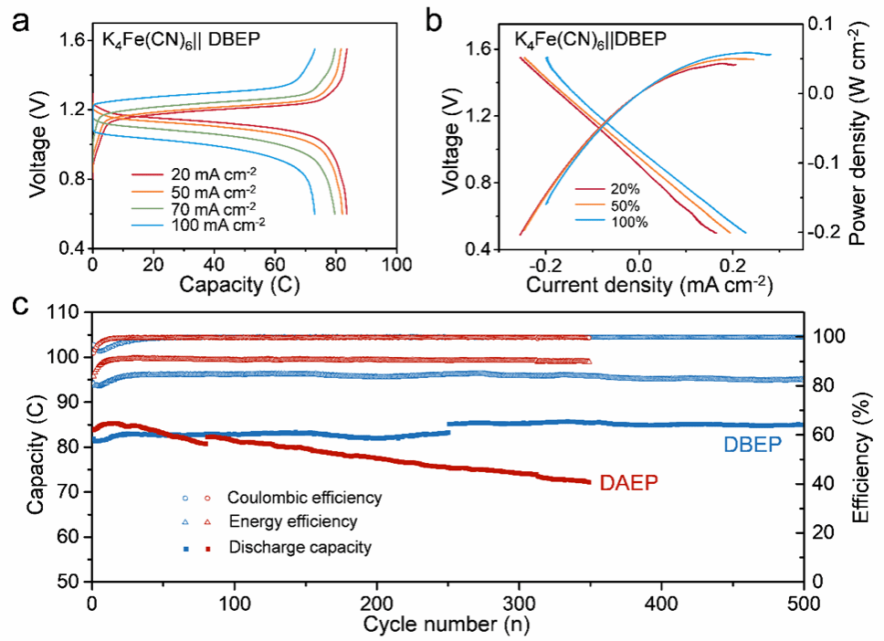 为了研究K4Fe(CN)6||DBEP的自放电行为,电池充电至1.55 V后静置24h,开路电压从1.28 V降低至1.25 V,充电容量512.0 C,放电容量降低至504.2 C。在下一个循环周期中,容量恢复至510.1 C。这一结果证明了还原状态下的DBEP在化学和电化学上都是稳定的。K4Fe(CN)6||DBEP ARFB的长期循环性能如图4所示,在pH值为14的408次循环中,放电容量从524.4 C逐渐衰减到512.8 C (469.2 h),容量保持率为97.8%,容量衰减率为0.005% /圈,即0.11% /天。这些结果证明了DBEP分子具有良好的电化学稳定性。因此,作者认为这里的容量衰减主要是由膜电阻和极化的增加引起的。