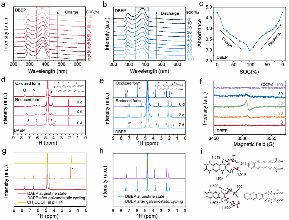 为了进一步阐明循环过程吩嗪核心的氧化还原行为,采用原位紫外-可见吸收分析表征了DBEP在不同充电/放电状态下的吸光度。随着充电过程的进行,?382nm处的吸收峰逐渐变宽,峰强度明显降低,并从382nm向375 nm偏移。在循环过程中,通过电子顺磁共振(EPR)检测到自由基阴离子DBEP3??的形成,作为DBEP2?还原过程的中间体。随着充电过程的继续,EPR信号强度增加,在50%荷电状态下达到最大,对应于DBEP3??浓度最高。随后EPR信号强度逐渐减弱。在100% SOC下,DBEP2?完全还原为DBEP4?,导致几乎无法检测到EPR信号。DAEP在恒流充电后的还原状态下出现新的核磁共振峰(图5d中以“*”表示),说明DAEP的分解可能是由于其烷基链的断裂导致CH3COOH的释放。质谱分析进一步支持了这一假设。相比之下,DBEP在还原状态下表现出高稳定性(图5d)。还原态DBEP的核磁共振谱随时间变化不明显,说明其容量保持良好。此外,恒流循环后DBEP的质谱图中没有出现与降解产物相关的明显峰。 作者进一步检测了恒流循环后DAEP和DBEP的未降解物以证明副反应的发生。如图5g所示,循环后DAEP谱中的新峰(标记为“*”)与pH为14时CH3COOH的峰相对应。相比之下,在pH 14下循环后的DBEP的氢谱几乎与原始DBEP相同(图5h)。DAEP的键长计算表明随着键长增加,侧链损失的可能性也增加。这表明DAEP的侧链更容易从吩嗪核上断裂。这项研究强调了在氧化还原活性有机分子的适当位置进行适当的官能团修饰对于提高ARFB的整体性能具有重要意义。