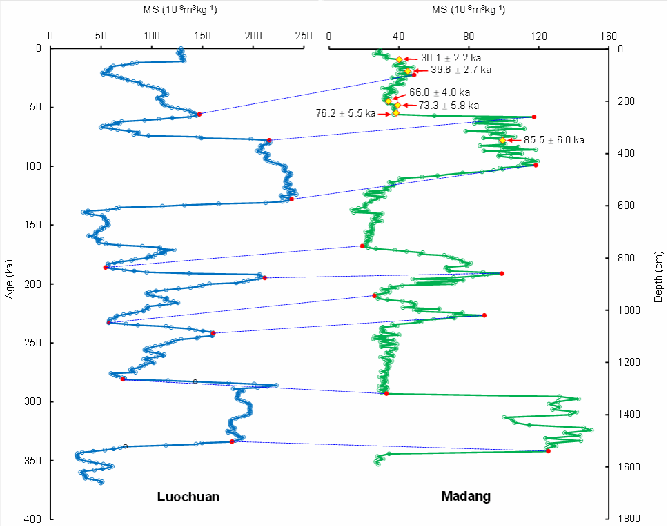 图1低纬马垱剖面与中纬洛川剖面磁化率曲线的对比。红色圆点为地层对比获得的年代标尺控制点,黄色菱形点为光释光样品的位置