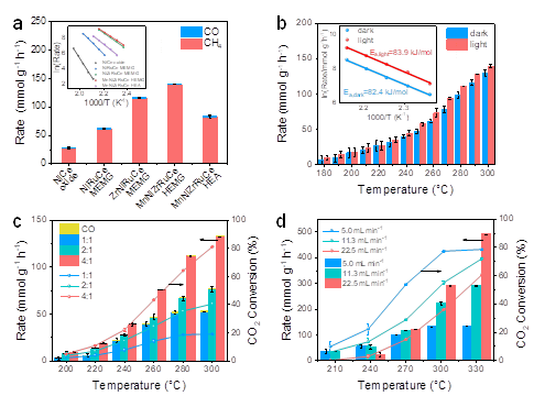 图2 MnNiZrRuCe HEMG的光热催化性能。(a)300℃、H2/CO2 = 4/1、流速5.0 mL·min-1、压力0.1 MPa、光强1.14 W·cm-2条件下的光热CO2甲烷化速率比较;(b)光暗条件下CO2甲烷化速率与对应的表观活化能对比;(c)不同H2/CO2比例下MnNiZrRuCe HEMG的光热CO2甲烷化性能;(d)不同流速下的CO2甲烷化速率