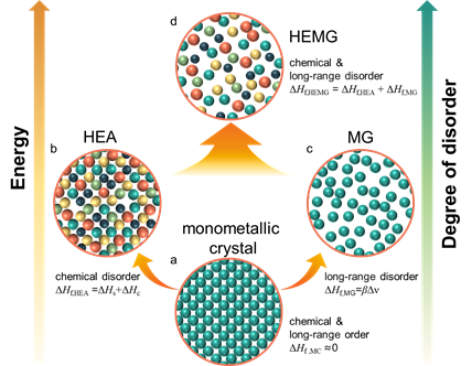 图1 结构和能量变化示意图。(a)单金属晶体(MCs);(b)HEAs;(c)MGs和(d)HEMGs。晶格完美的MC处于低能稳定状态,其生成焓(ΔHf,MC)近似为零。HEAs和MGs分别是化学无序和长程无序的,使得生成焓增加。化学无序和长程无序的HEMG具有ΔHf,HEA和ΔHf,MG共同贡献的ΔHf,HEMG