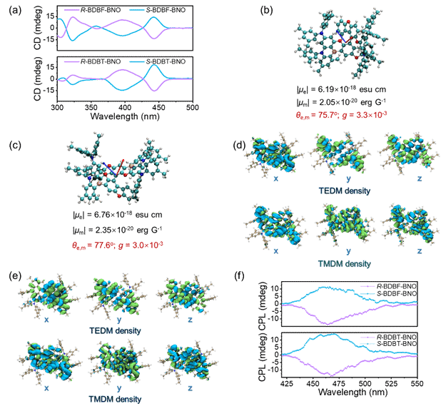 图2. (a) 甲苯溶液中(R/S)-BDBF-BNO和(R/S)-BDBT-BNO的CD光谱;理论计算的(b) (S)-BDBF-BNO和(c) (S)-BDBT-BNO的S1态的跃迁电偶极矩(红色箭头)、磁偶极矩(蓝色箭头)和夹角;(d) (S)-BDBF-BNO和(e) (S)-BDBT-BNO的TEDM和TMDM密度分布;(f) 甲苯溶液中(R/S)-BDBF-BNO和(R/S)-BDBT-BNO的CPL光谱。