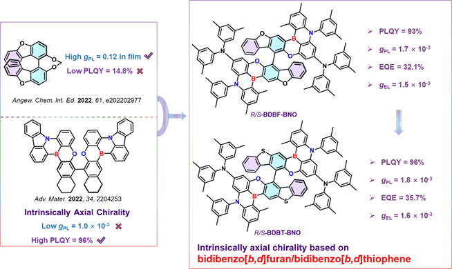手性多重共振热激活延迟荧光(CP-MR-TADF)材料由于其可以兼具高色纯度、高发光效率和圆偏振发光(CPL)等性质特点,在制备圆偏振有机电致发光器件(CP-OLED)以实现3D显示中展现出巨大的应用前景。