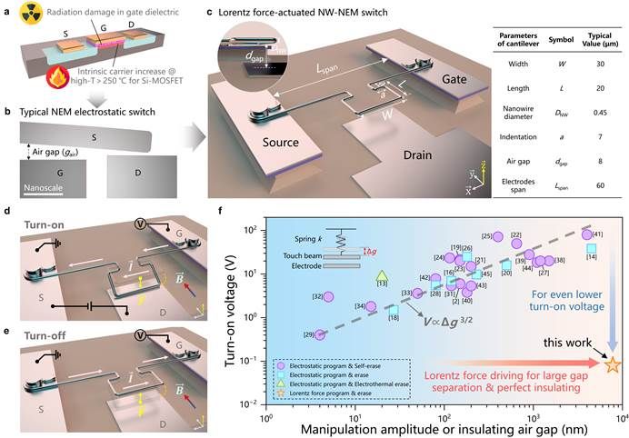 面向核事故救援、核战场和外太空等极端苛刻的应用场景,现有的电子逻辑和存储器件的耐用性面临着巨大的挑战,尤其是针对其耐辐射和耐高温方面具有极大的需求。对于传统的晶硅场效应晶体管器件(Field-Effect-Transistor, FET)来说,其栅极电介质易因积累辐射损伤或高温(>250 ℃)而产生热载流子击穿而导致性能下降甚至失效。相对而言,完全依靠机械控制开关状态的纳机电(Nano-Electro-Mechanical, NEM)开关则相对不受高温和强辐射的影响,在诸多恶劣环境下具有优异的鲁棒性,此外,还具有准零漏电流、极低的亚阈值摆幅和极高的电流开关比等优势。使其成为具有代替传统FET器件的理想选择之一。