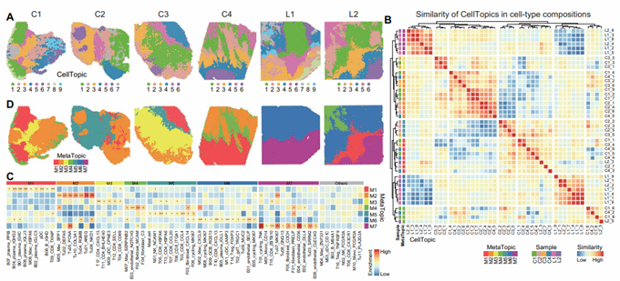综上所述,该研究展示了SpaTopic在解析和注释肿瘤微环境中细胞空间域方面的强大能力。通过识别具有一致基因表达模式和细胞类型构成的空间域,SpaTopic不仅能够揭示肿瘤微环境中的潜在功能单元,还支持跨样本和跨数据集的定量比较,具有较好的适用性。