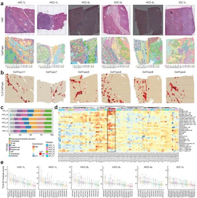 三级淋巴结构是非淋巴组织中因慢性炎症形成的独特免疫微环境,包含B细胞、T细胞、树突状细胞(DCs)等多种免疫细胞。TLSs的细胞组成因组织和炎症条件的不同而存在变异,给计算预测带来挑战。通过对原发性肝癌的空间转录组数据进行分析,SpaTopic识别出与TLSs相关的空间域,这些空间域与B细胞、T细胞和树突状细胞等免疫细胞紧密共定位,形成了典型的TLSs结构。此外,SpaTopic不仅为TLSs的识别提供了一种无偏的方法,其衍生的标记基因集TLS-25在不同癌症类型中显示出一致的表达模式,能够有效预测TLS的存在,并与患者的生存率相关联。