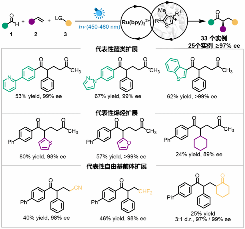针对这些难题,黄小强团队利用可见光激发和定向进化手段,将苯甲醛裂解酶“重塑”为三组分自由基酶(3CRE),实现了一例非天然的高对映选择性的三组分自由基偶联反应,并且结合机理实验解析了这一新功能的化学机制。该体系能够组合三个可变的底物,极大丰富了光生物合成的多样性,是光酶领域的一个标志性成果(图1