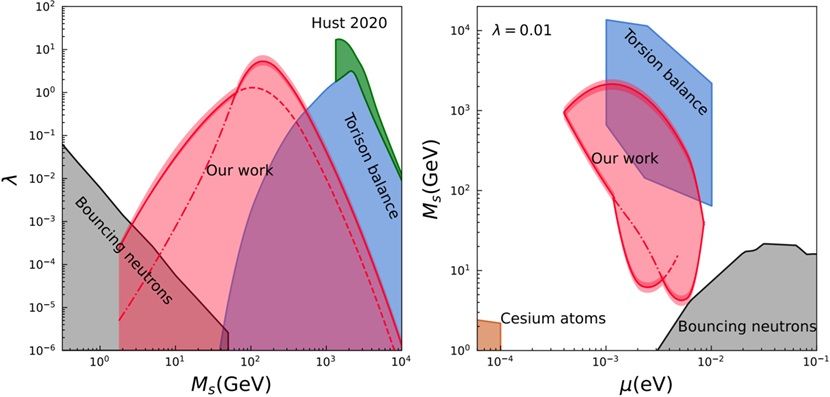 图2. 本研究中暗能量检测结果:对称场暗能量场与普通物质的耦合界限,λ-Μs 参数平面(左)和Μs-μ 参数平面(右)。各染色区域代表被实验检验并被排除的参数区间,红色区域代表本研究结果。