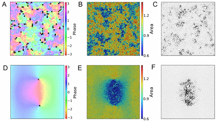 图 2:(A)同步转变点处的脉动相位场,颜色代表相位。空心圆和实心圆分别代表+1和-1拓扑缺陷。(B)同步转变点处的细胞面积分布,颜色代表面积大小。(C)同步转变点处的速度场。(D-F)一对拓扑缺陷附近的脉动相位场(D),细胞面积分布(E)和速度场(F)。