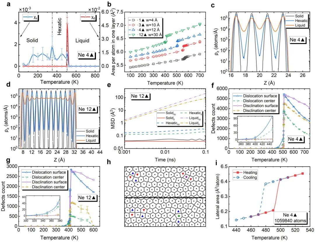 随着温度升高,相比于传统的冰熔化成水,受限单层(纯二维)物质的固体和液体中间,还存在一种被称为六角(Hexatic)相的状态,这种状态与物质的低维材料的拓扑特征高度相关,可以被刻画二维固体的熔化图像的KTHNY理论来描述,其中存在两个连续相变(固体到hexatic再到液体)。