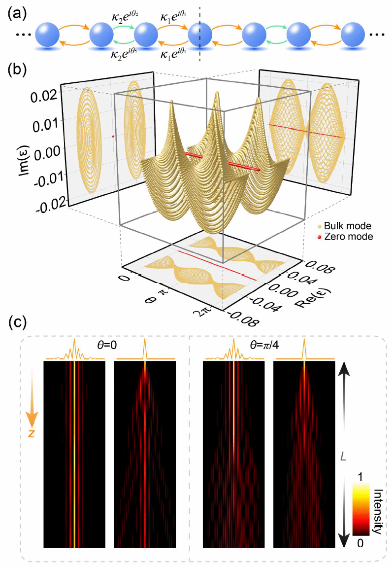 在本工作中,研究人员考虑了具有非厄米耦合相位的Su-Schrieffer-Heeger (SSH) 模型(如图1(a)),通过引入辅助复耦合系数调节其耦合相位,可以实现耦合系数由保守(纯实数)到混合(复数)再到耗散(纯虚数)的连续转变。研究发现,该模型的拓扑性质由胞内/胞间的耦合强度差决定,而耦合相位会改变体带在复能谱空间中的分布。随着耦合相位θ增大,体带发生了扭曲,并出现了虚部分量,而拓扑态由于体系的对称性约束始终是一个零模,如图1(b)所示。所有耦合相位对应的拓扑态都具有相同的局域程度,然而它们的动力学演化行为却非常不同。例如,对于保守拓扑(θ=0),不管是单根激发(偏离完美本征态较多,保真度约为0.6),还是接近完美的本征态(保真度约为0.98),都能支持拓扑态的激发和演化;而对于一般的混合拓扑情形(如θ=π/4),单根激发拓扑态将很容易弥散,而接近完美本征态的激发虽能演化更长的距离,最终还是出现了明显弥散现象(图1(c)),这意味着此时的拓扑态是很敏感的,极易受到扰动而偏离拓扑态。
