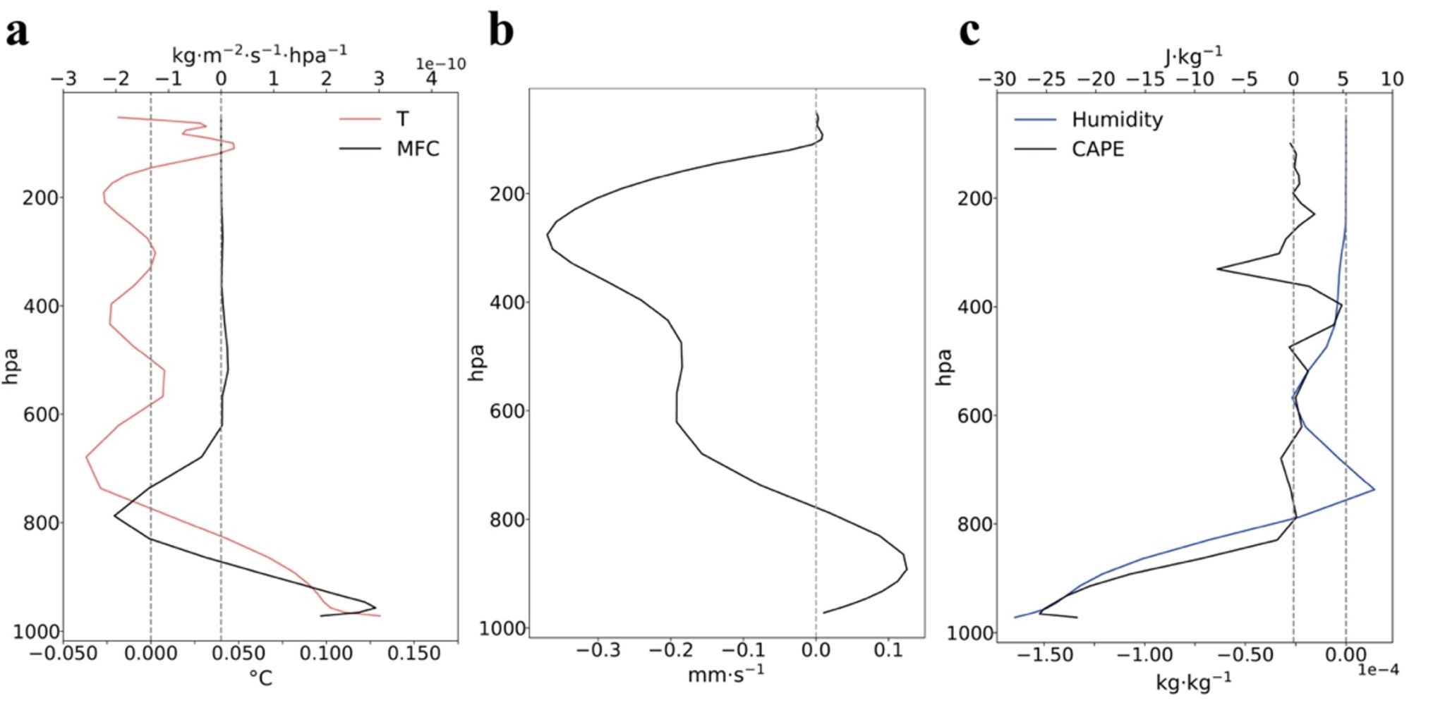 图2巴西亚马逊(a)水汽通量散度(黑色;单位:kg?m-2?s-1?hpa-1)、气温(红色;单位:oC)、(b)垂直速度(单位:mm?s-1)、(c)对流有效位能(黑色;单位:J?kg-1)、比湿(蓝色;单位:kg?kg-1)对森林流失响应的垂直廓线。