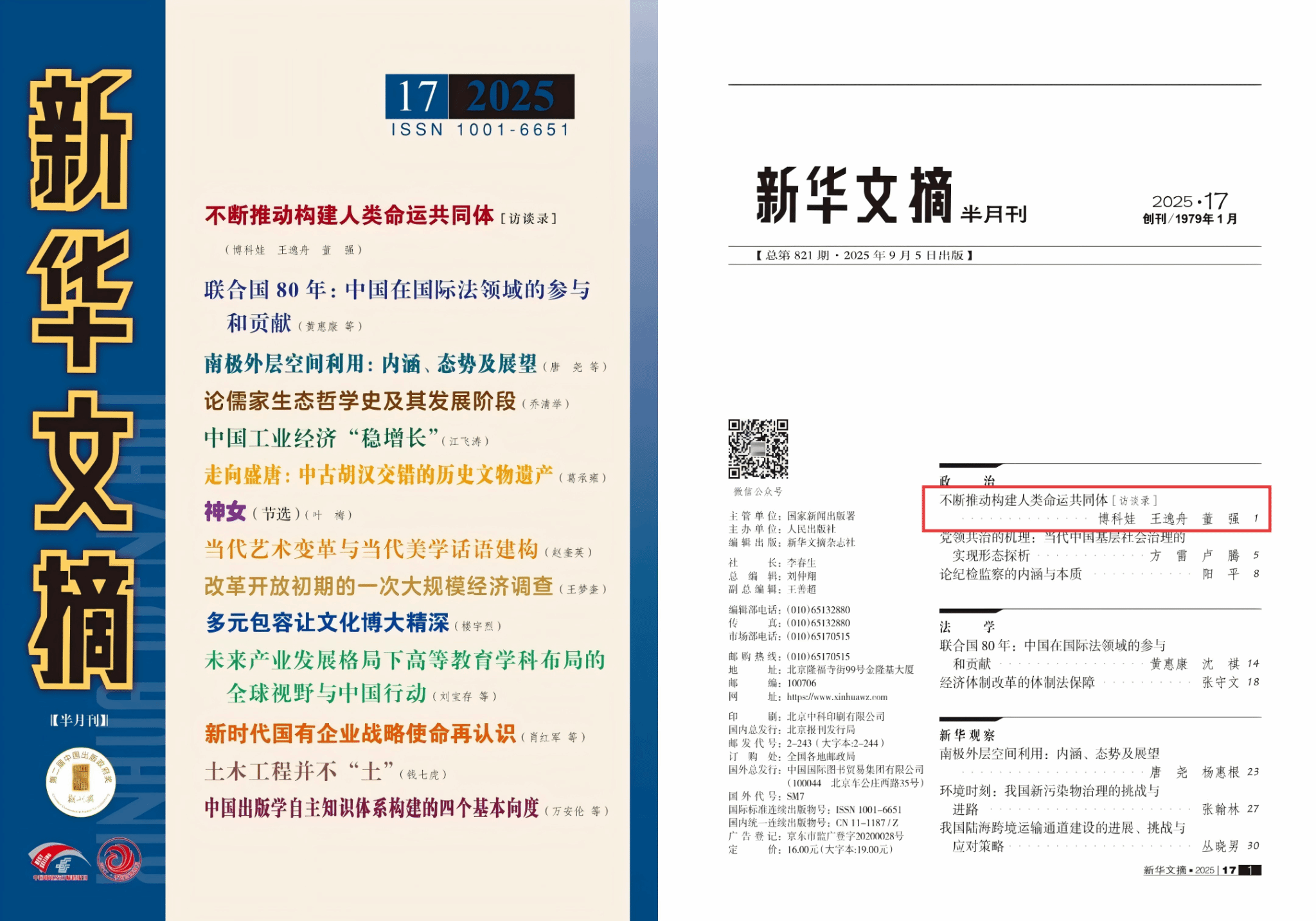 凯发k8官网区域国别研究院院长王逸舟教授等的访谈录《不断推动构建人类命运共同体》,被国内最具影响的哲学社会科学文摘类杂志《新华文摘》2025年第17期作为封面文章转载。
